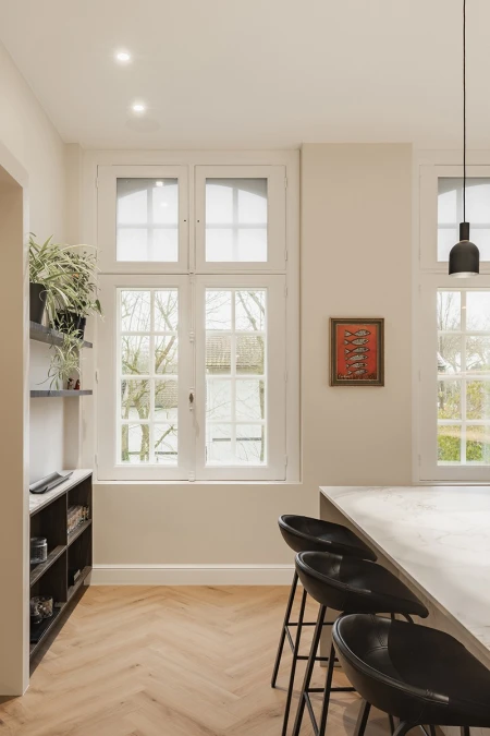 Výsledkem je dům, který dýchá šarmem a charakterem, ale zároveň je zcela připraven na budoucnost. Autentické prvky: vysoké stropy, elegantní lišty a velká okna, byly pečlivě restaurovány. Současně byl dům vybaven nejnovějšími technologiemi: podlahové vytápění, energeticky úsporné tepelné čerpadlo a inteligentní domotika zajišťují dosud nevídaný zážitek z bydlení.