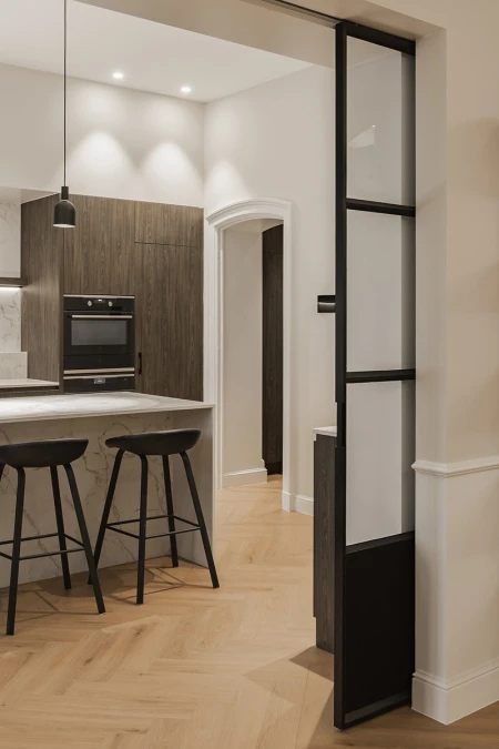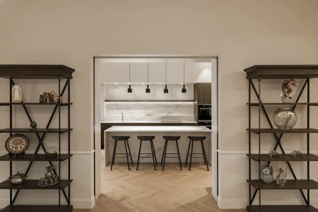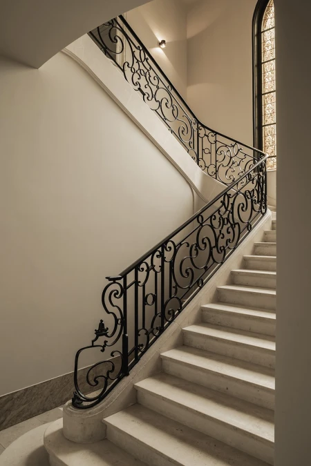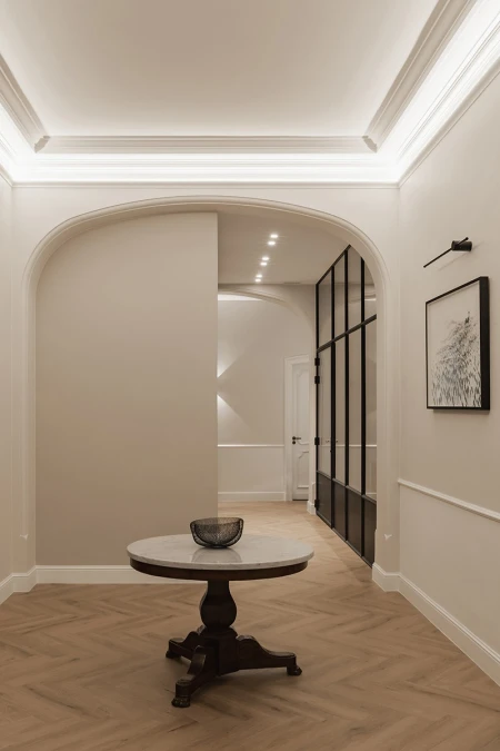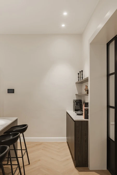 Interiér je jemnou hrou starého a nového. Teplé odstíny dřeva, jemný přírodní kámen a jemné látky, jako je len, zajišťují nadčasovou eleganci. Moderní osvětlovací prvky dodávají atmosféru a zdůrazňují architektonické detaily budovy. Každá místnost vypráví svůj vlastní příběh, ale společně tvoří harmonický celek.